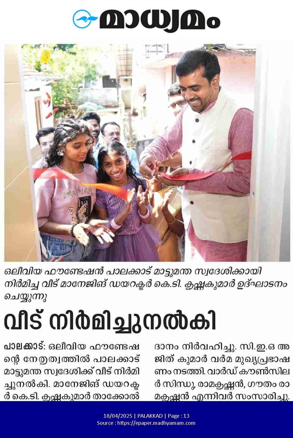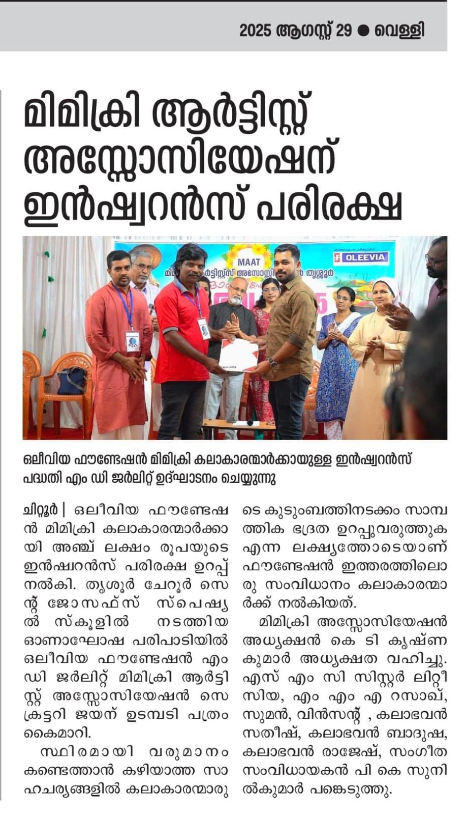 Oleevia Foundation Extends Insurance Support to Theatre Artists of Thrissur
