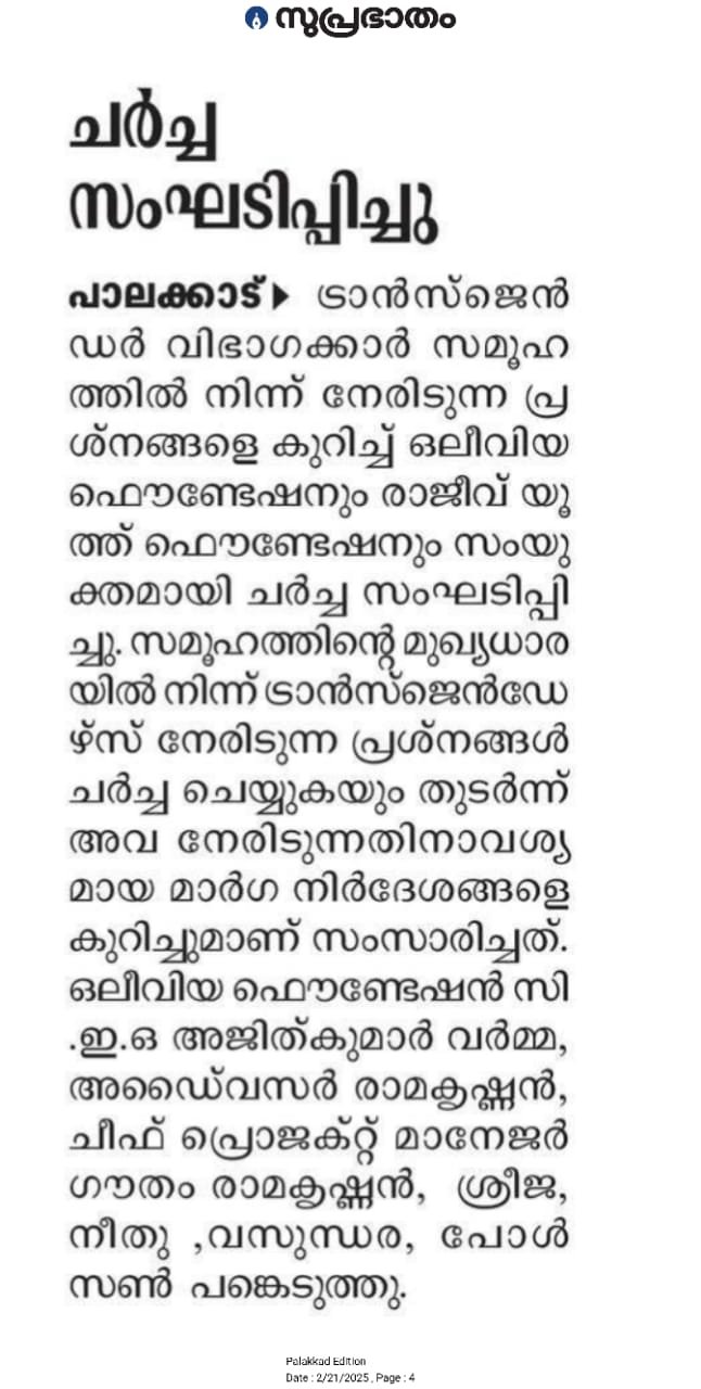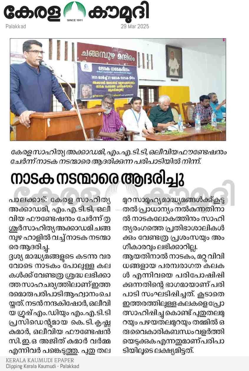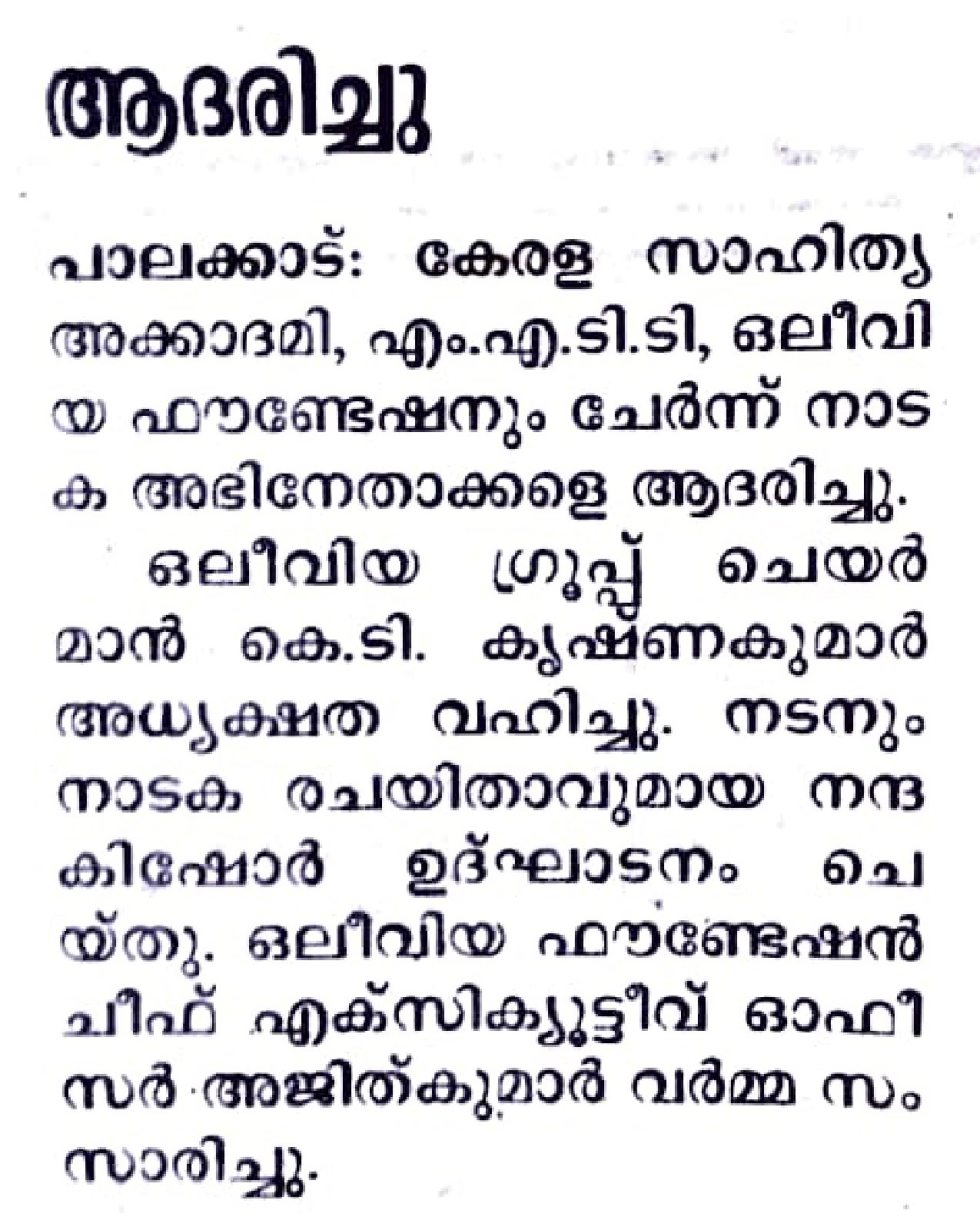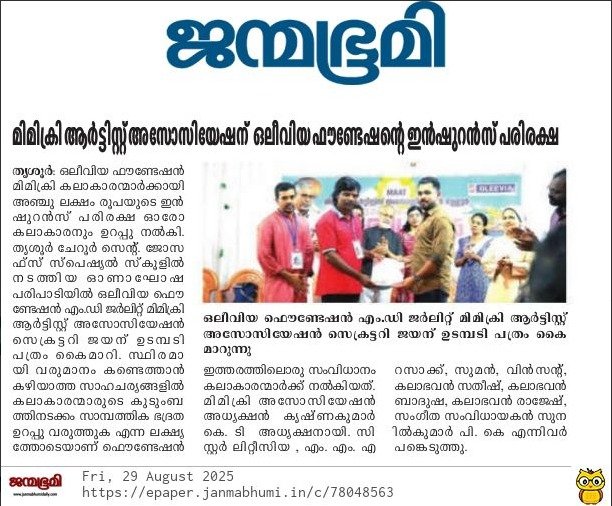 Oleevia Foundation Extends Insurance Support to Theatre Artists of Thrissur